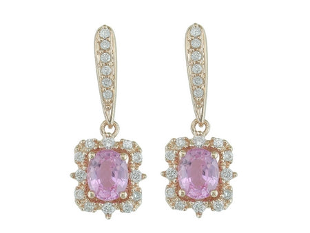 14K Rose Gold Pink Sapphire with Vintage Diamond Halo Dangle Earring