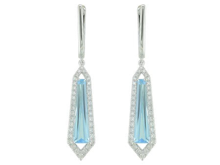 14K White Gold Elongated Elegance North South Set Blue Topaz with Diamond Halo Dangle Earrings