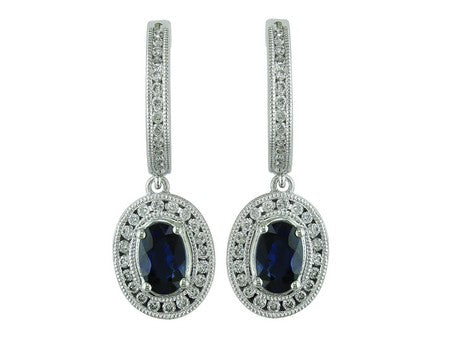 14K White Gold Sapphire with Milgrain Diamond Halo Earring