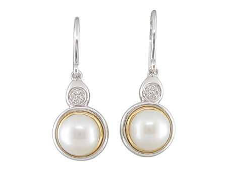 18K Two Toned Yellow & White Gold Bezel Set Pearl with Accent Diamond Dangle Earring