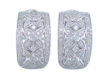 14K White Gold Flower Inlay Diamond Hoops