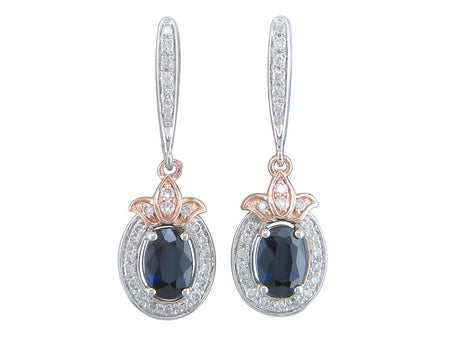 14K Two Tone White & Rose Gold Sapphire with Diamond Halo Dangle Earring