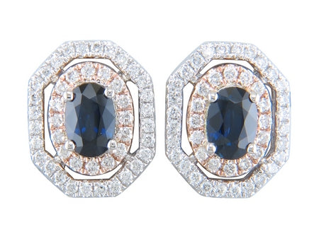 14k Two Tone White & Rose Gold Sapphire with Double Diamond Halo Earring