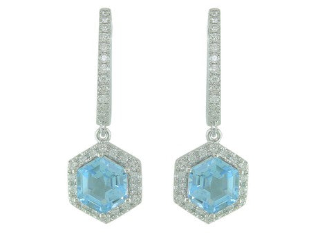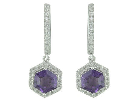 14K White Gold Hexagon Amethyst with Diamond Halo Dangle Earrings