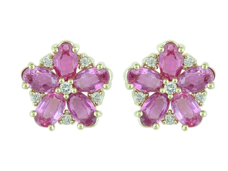 14K Yellow Gold Pink Sapphire & Diamond Flower Earrings