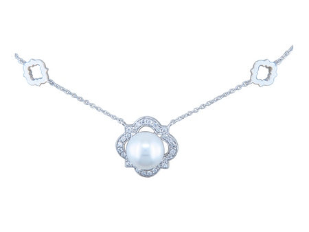 14K White Gold Pearl & Diamond Halo Necklace with Station Accents