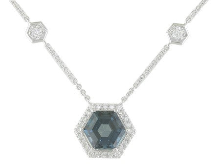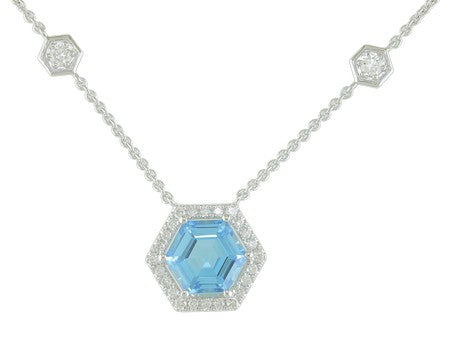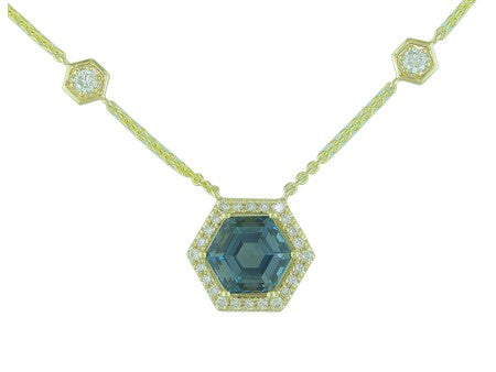 14K Yellow Gold Hexagon London Blue Topaz with Diamond Halo Necklace