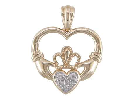 10K Yellow Gold with White Rhodium Diamond Claddagh Pendant