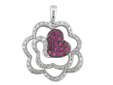 18K White Gold with Black Rhodium Ruby Heart with Diamond Swirl Frame Pendant