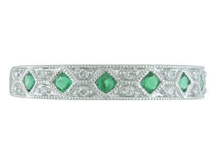 14K White Gold Milgrain Emerald & Diamond Geometric Band