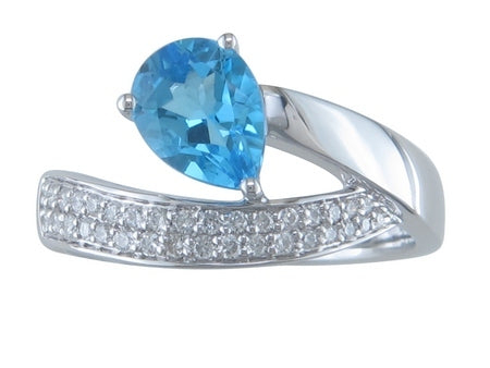 14K White Gold Blue Topaz & Diamond Bypass Ring