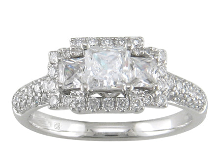14K White Gold Three Stone Diamond Halo Pave Engagement Ring