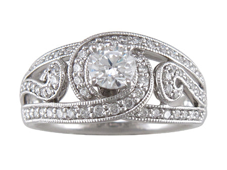 14K White Gold Diamond Milgrain Swirl Halo Semi Mount Engagement Ring