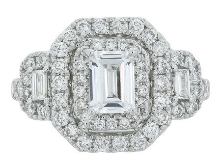 14K White Gold Three Stone Double Halo Diamond Engagement Ring