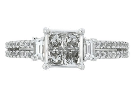 18K White Gold Quad Set Center Diamond with Two Side Stones Engagement Ring