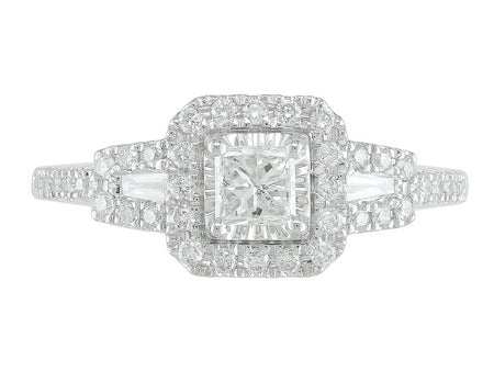14K White Gold Three Stone with Diamond Halo Engagement Ring