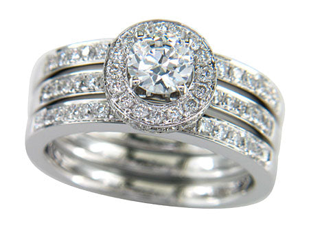 14K White Gold Diamond Halo Semi Mount Engagement & Double Wedding Band Set