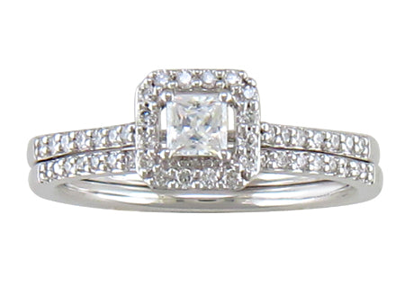 14K White Gold Diamond Halo Engagement & Wedding Band Set