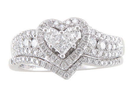 10K White Gold Diamond Halo Heart Engagement & Wedding Band Set
