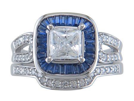 14K White Gold Sapphire & Diamond Split Shank Halo Engagement & Wedding Band Set