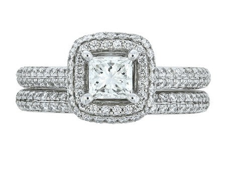 14K White Gold Diamond Pave Halo Engagement & Wedding Band Set