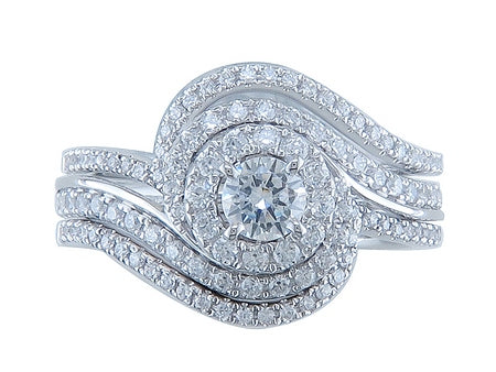 14K White Gold Bypass Diamond Double Halo Engagement & Wedding Band Set