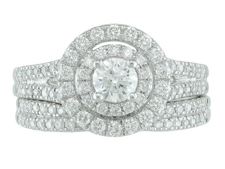 18K White Gold Split Shank Diamond Double Halo Engagement & Wedding Band Set